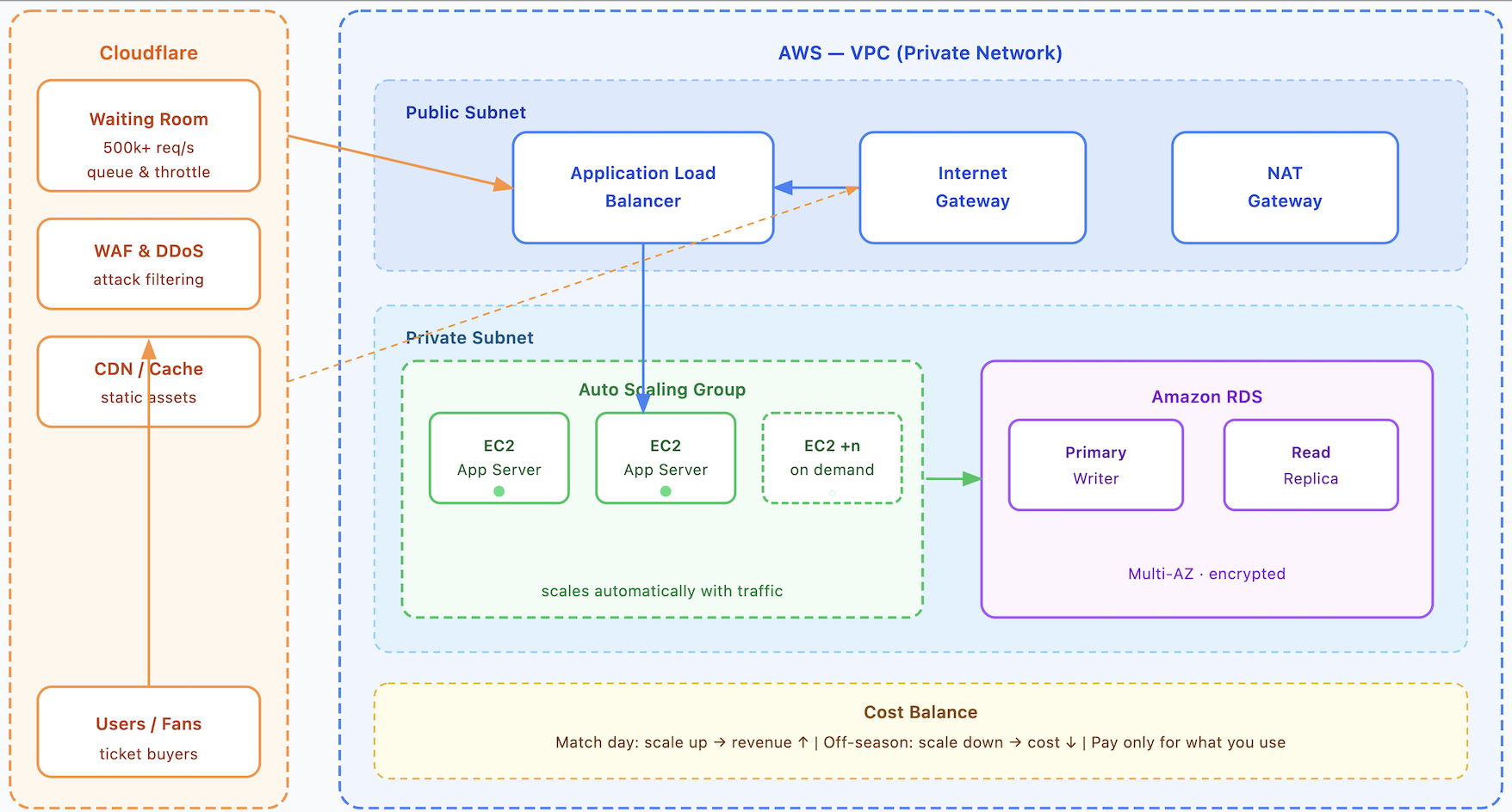 A key outcome is the cost balance: infrastructure scales up on match days when ticket revenue is at its peak, then scales